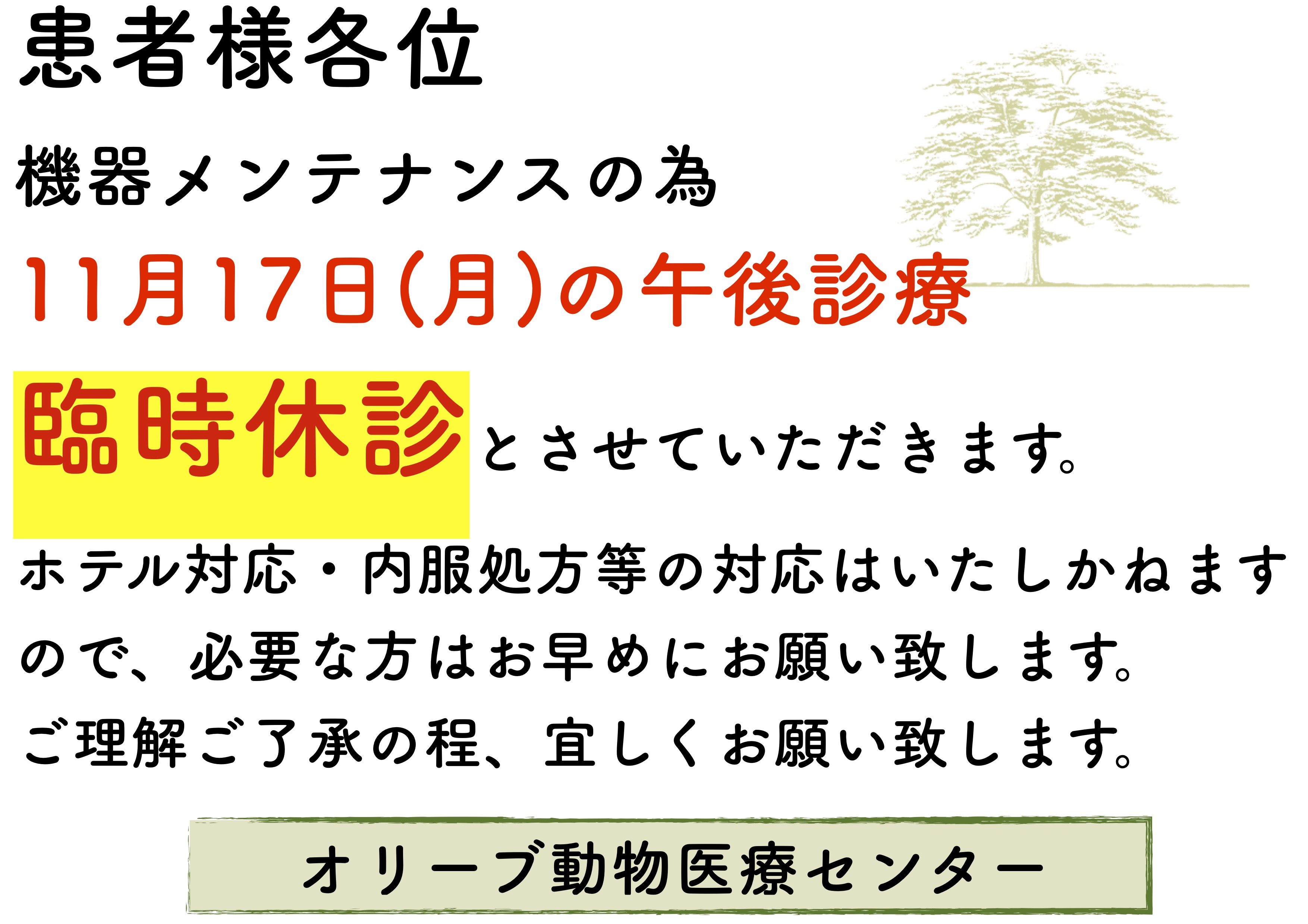 11/17(月)午後診察は機器メンテナンスの為、臨時休診とさせて頂きます。