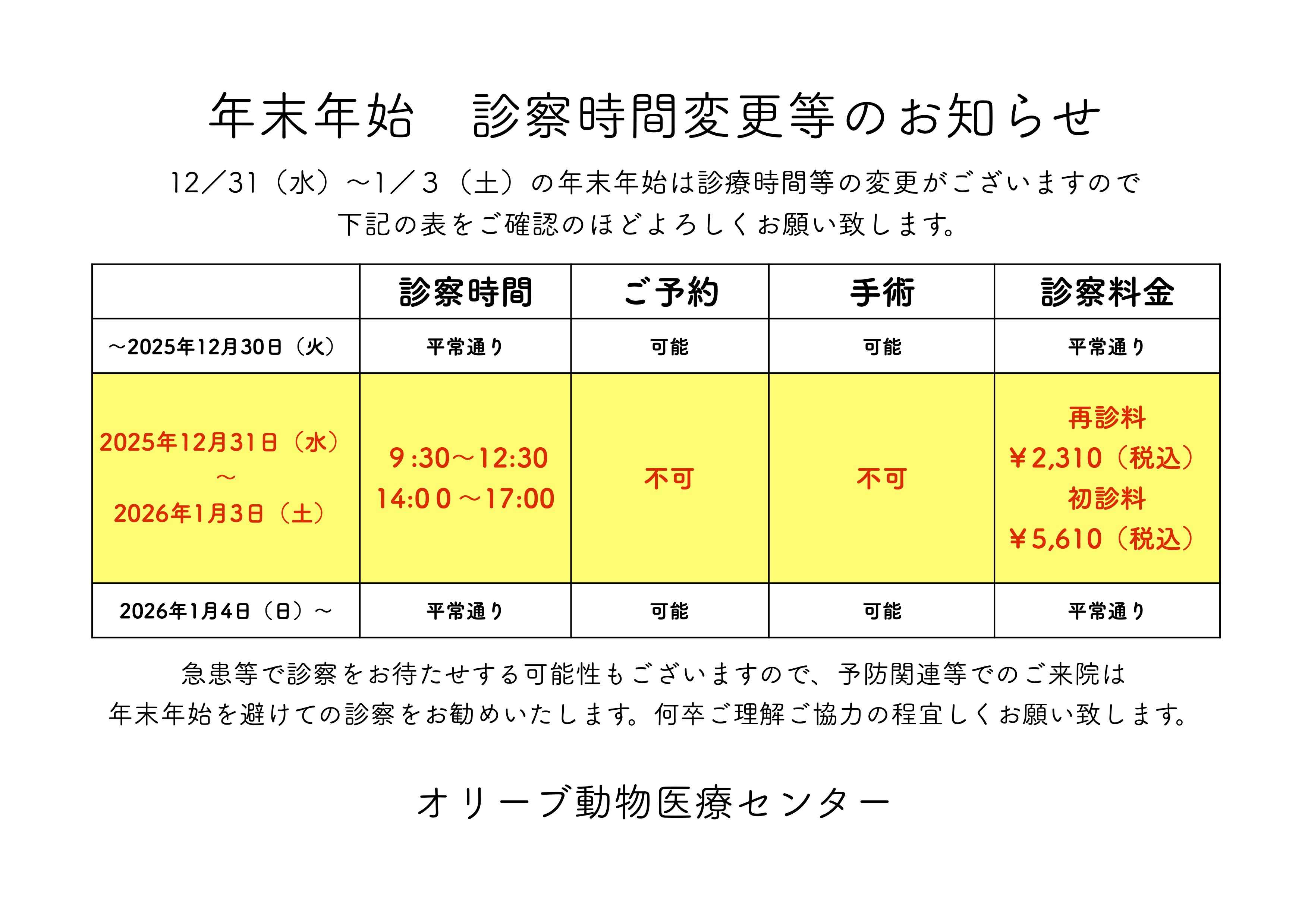 12月31日(水)〜1月3日(土)の年末年始は診療時間等の変更がございます。